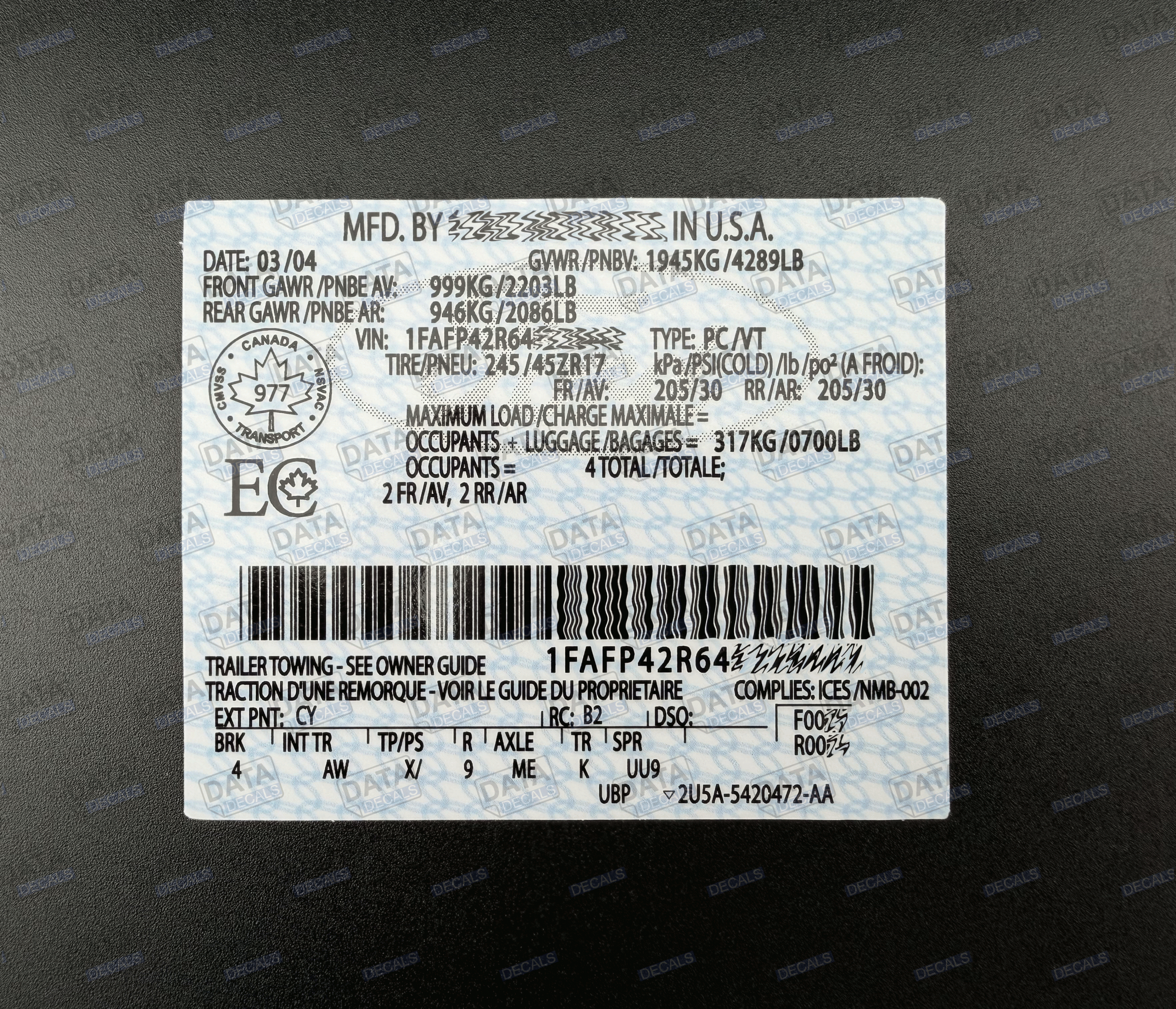 FORD Door Jamb Data Decal Permanent Sticker ID Tag Derated Custom CANADA